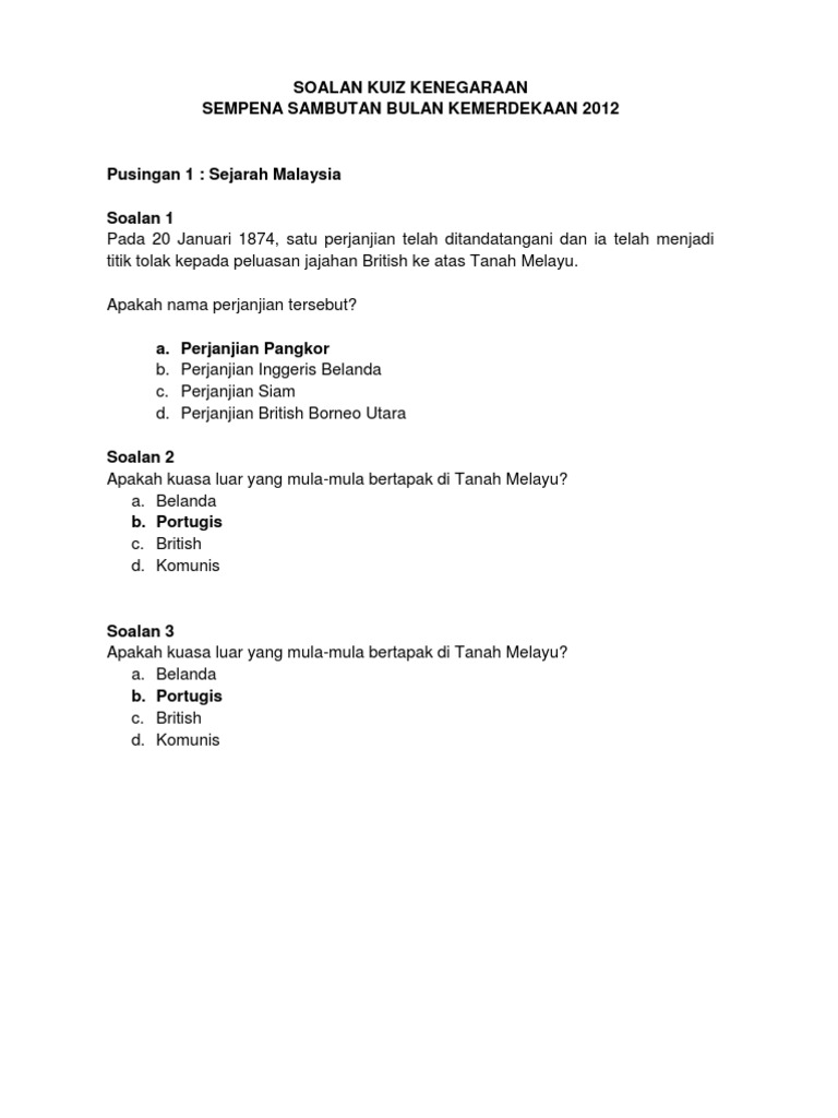 Soalan kertas 3 sejarah tingkatan 5 bab 4 malayan union. 100 soalan kuiz sains draft. Sejarah malaysia soalan 1 pada 20 januari 1874, satu perjanjian telah ditandatangani dan ia telah menjadi titik tolak kepada peluasan jajahan british ke atas tanah melayu. Kuiz sejarah malaysia sesi 2017/2018. Kertas peperiksaan ini adalah untuk subjek sejarah.